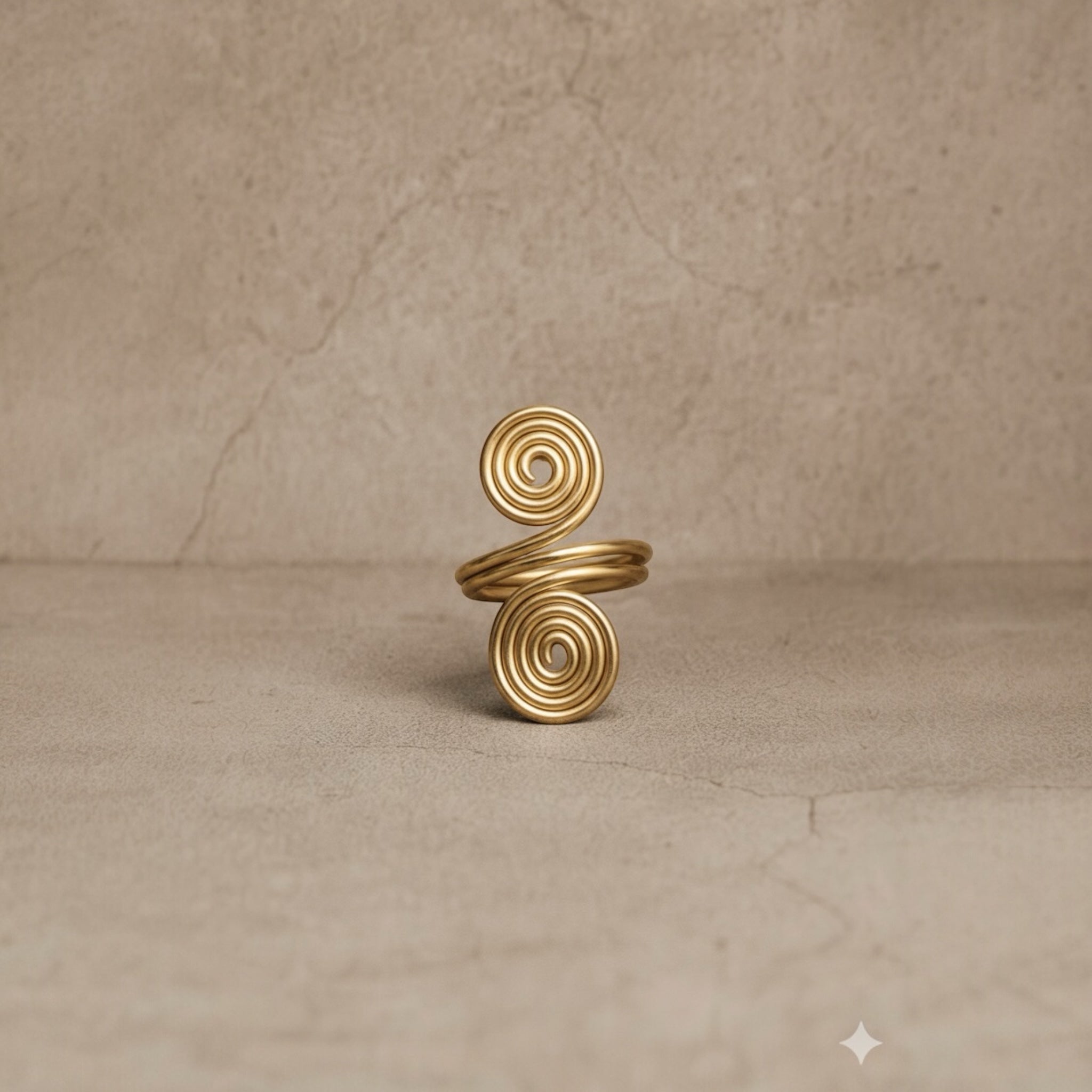 - Produktbeskrivelse : Denne skulpturelle ringen er en dristig hyllest til bevegelse og flyt. Den er håndvridd til doble spiraler og henter inspirasjon fra gamle afrikanske symboler for vekst og evolusjon.