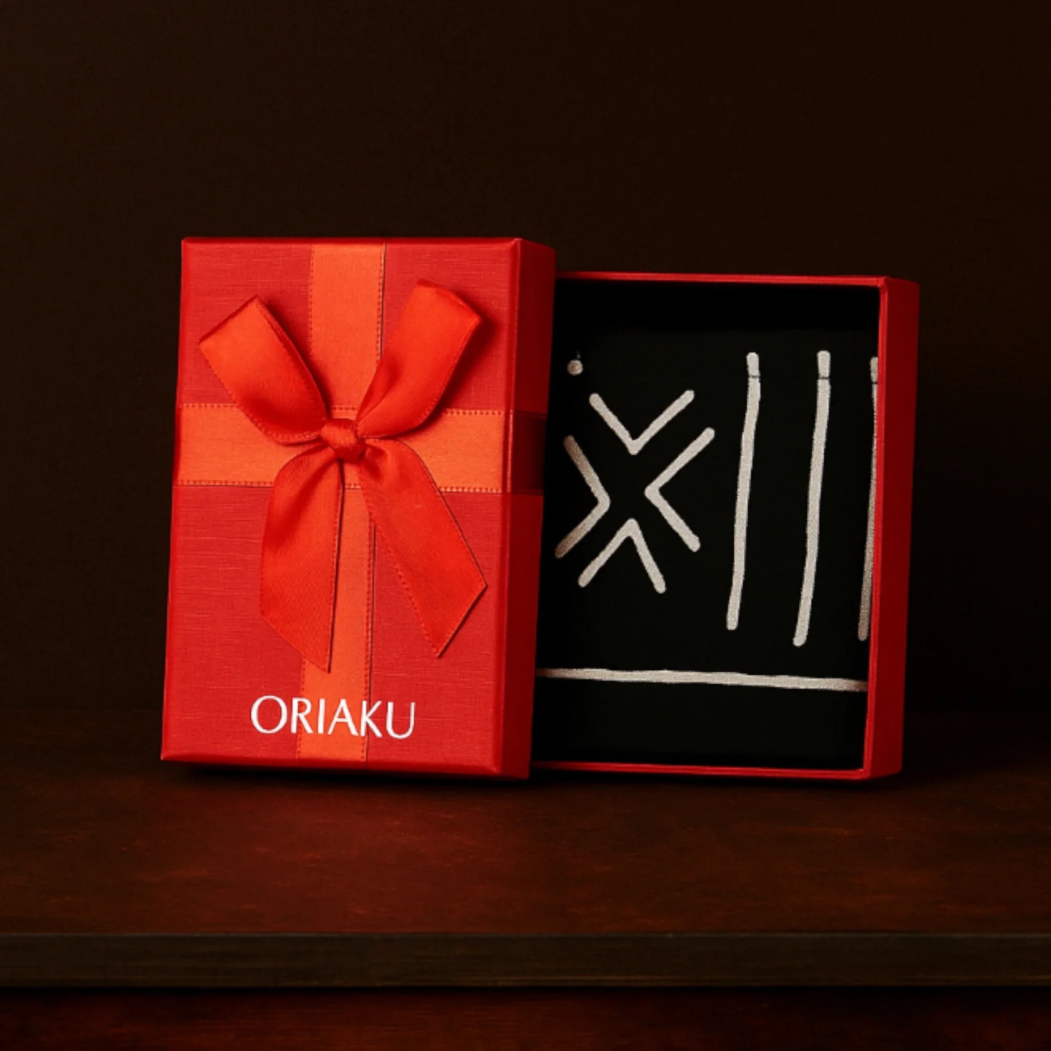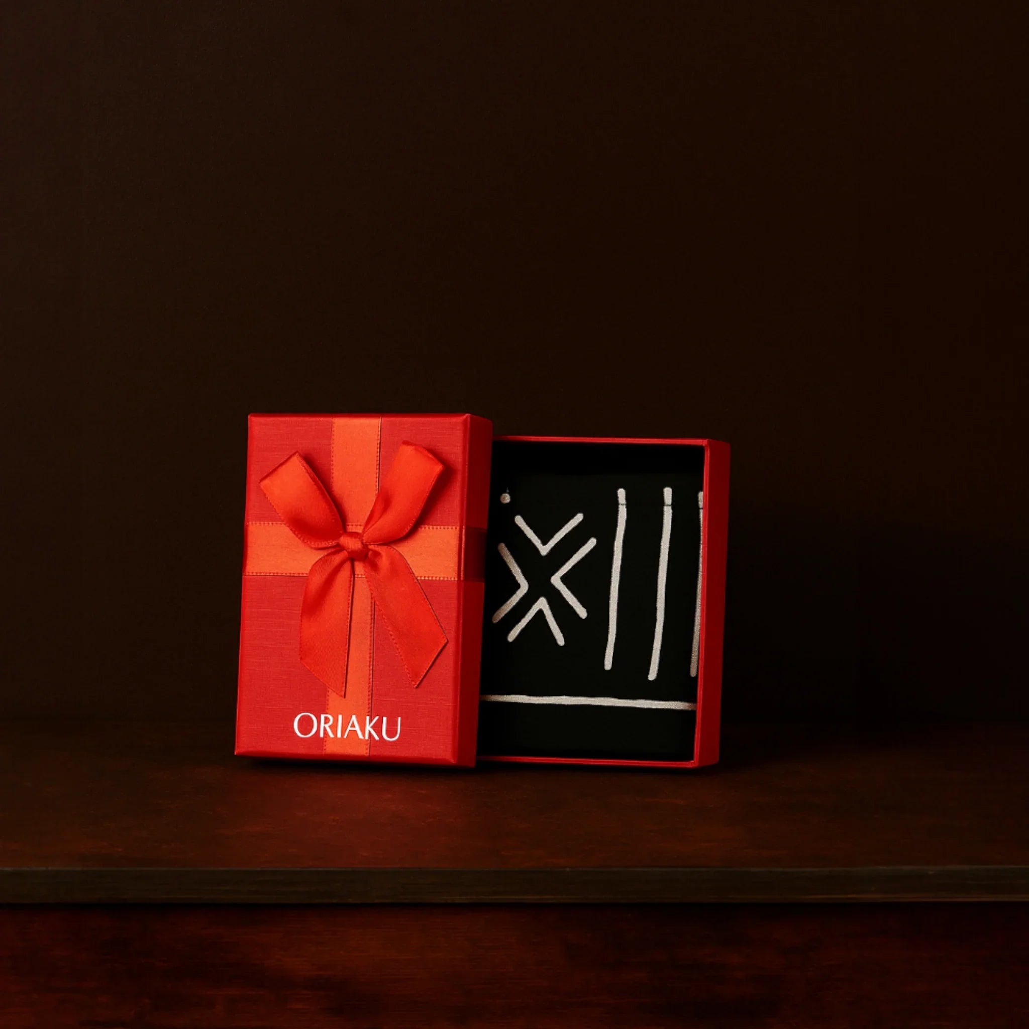 - Produktbeskrivelse : Oriaku Signature-gaveesken er designet for gavebruk. Den er pakket inn i rik rødfarge med en satengsløyfe og preget gulllogo, og åpnes for å avdekke en pose som gir et preg av arv til hvert smykke. Ideell for å presentere fine smykker med eleganse og kulturell dybde.