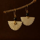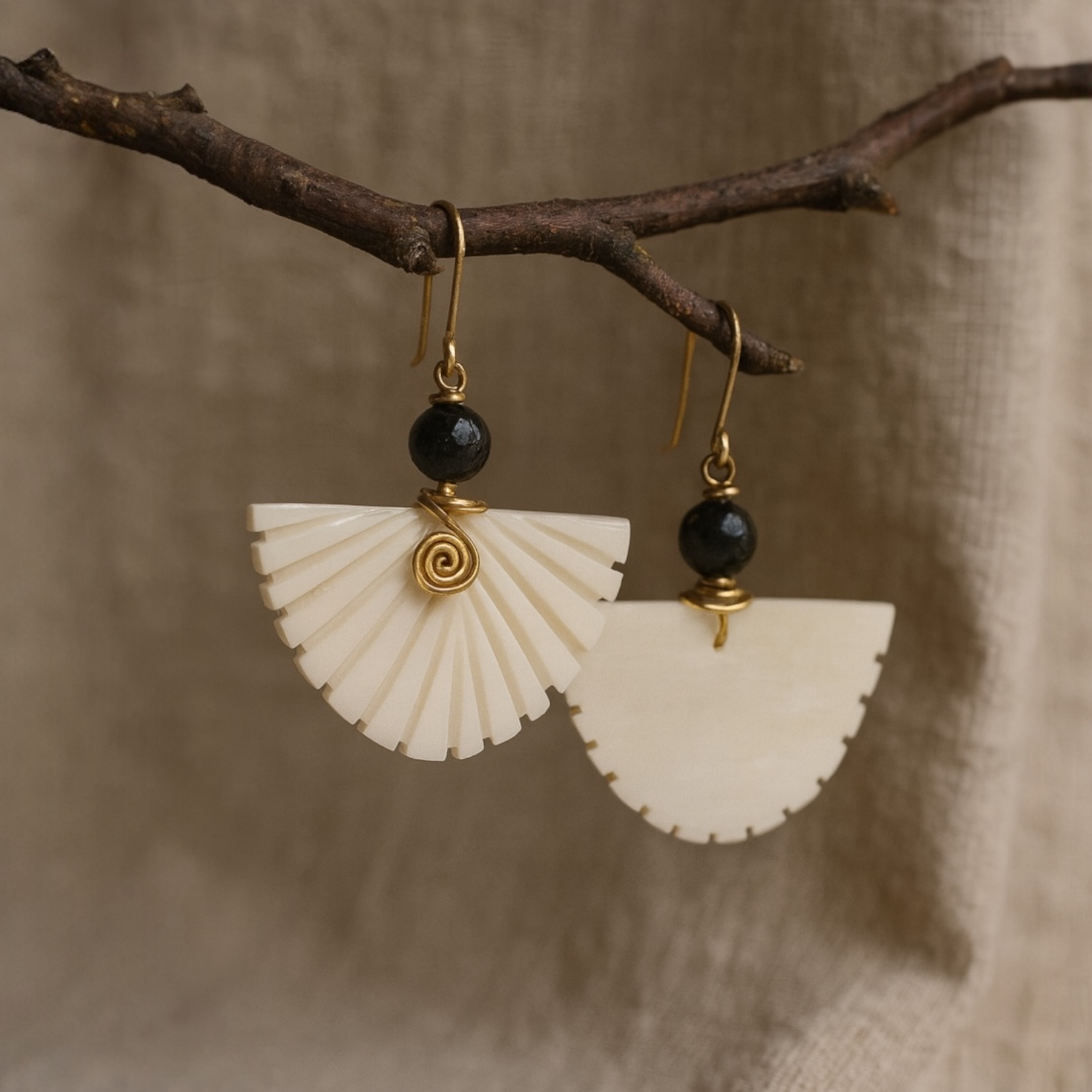 - Produktbeskrivelse : Kulu-øredobbene fanger rolig eleganse gjennom et vifteformet elfenbensdesign balansert av svart onyx og gylne spiraler.