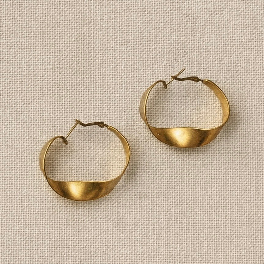 - Product Description: Sculptural and minimal, these hoops hold a warm brass glow with gentle curves that frame the face with quiet confidence.
