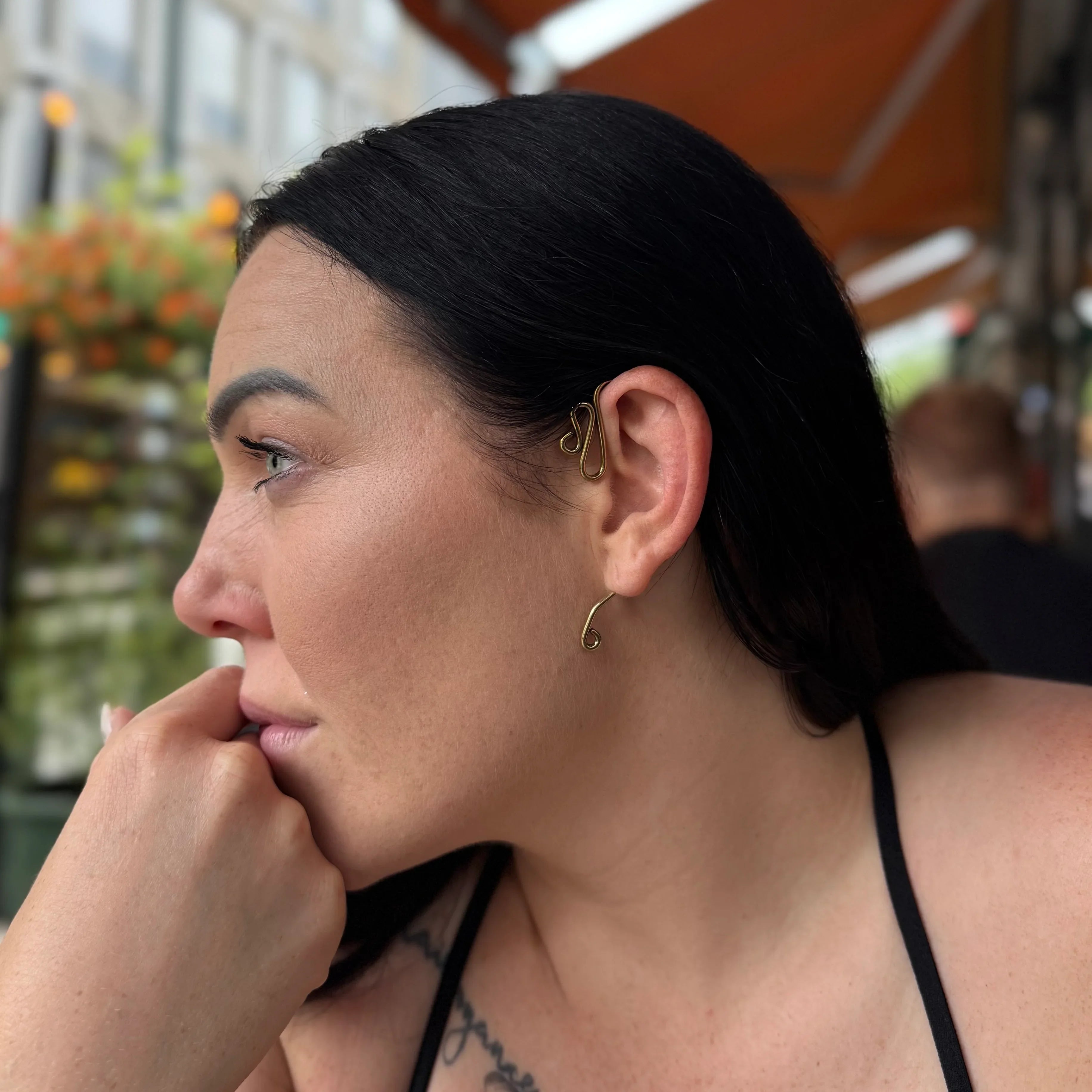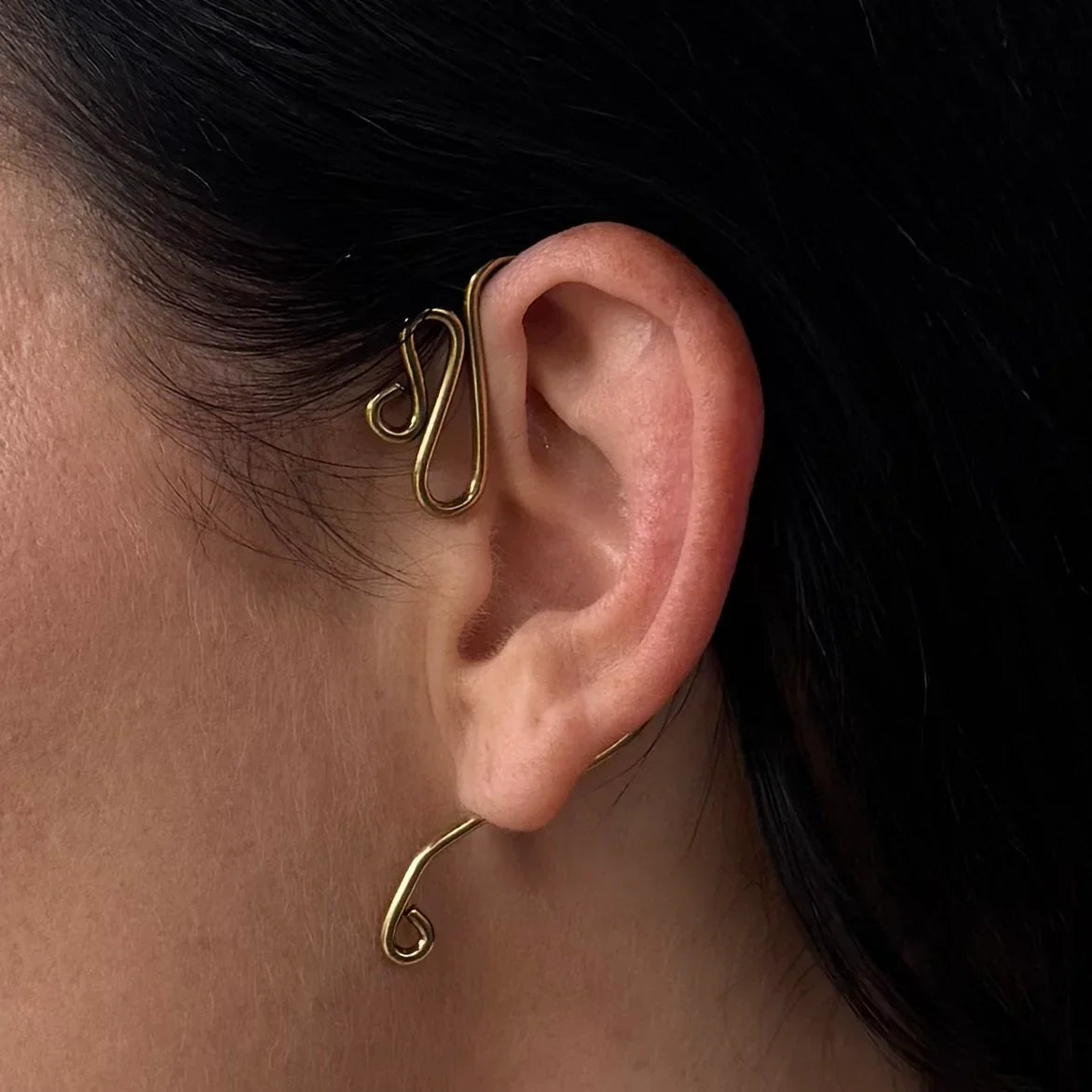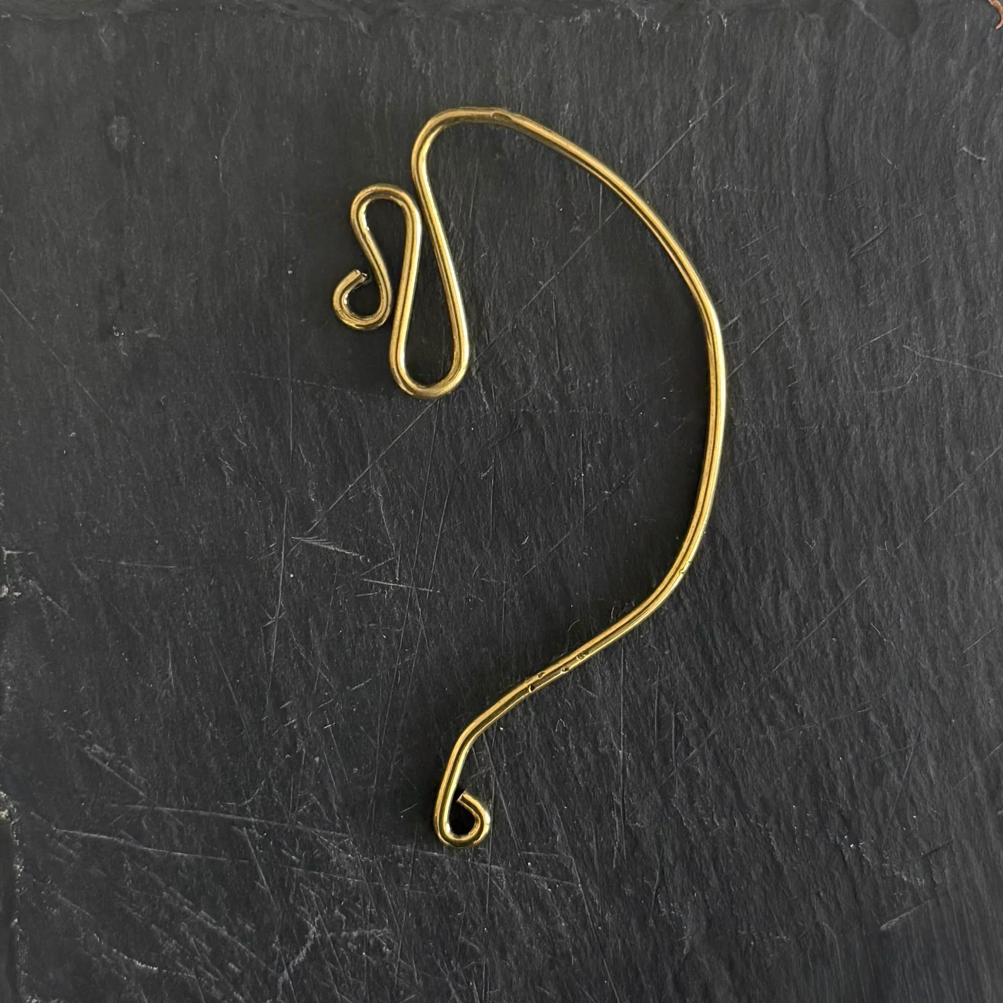 - Produktbeskrivelse : En avantgardistisk ørecuff som danser langs øret med sløyfer i messing. Ingen piercing nødvendig, den hviler lett samtidig som den gir et dristig uttrykk. Lett og komfortabel å ha på seg.