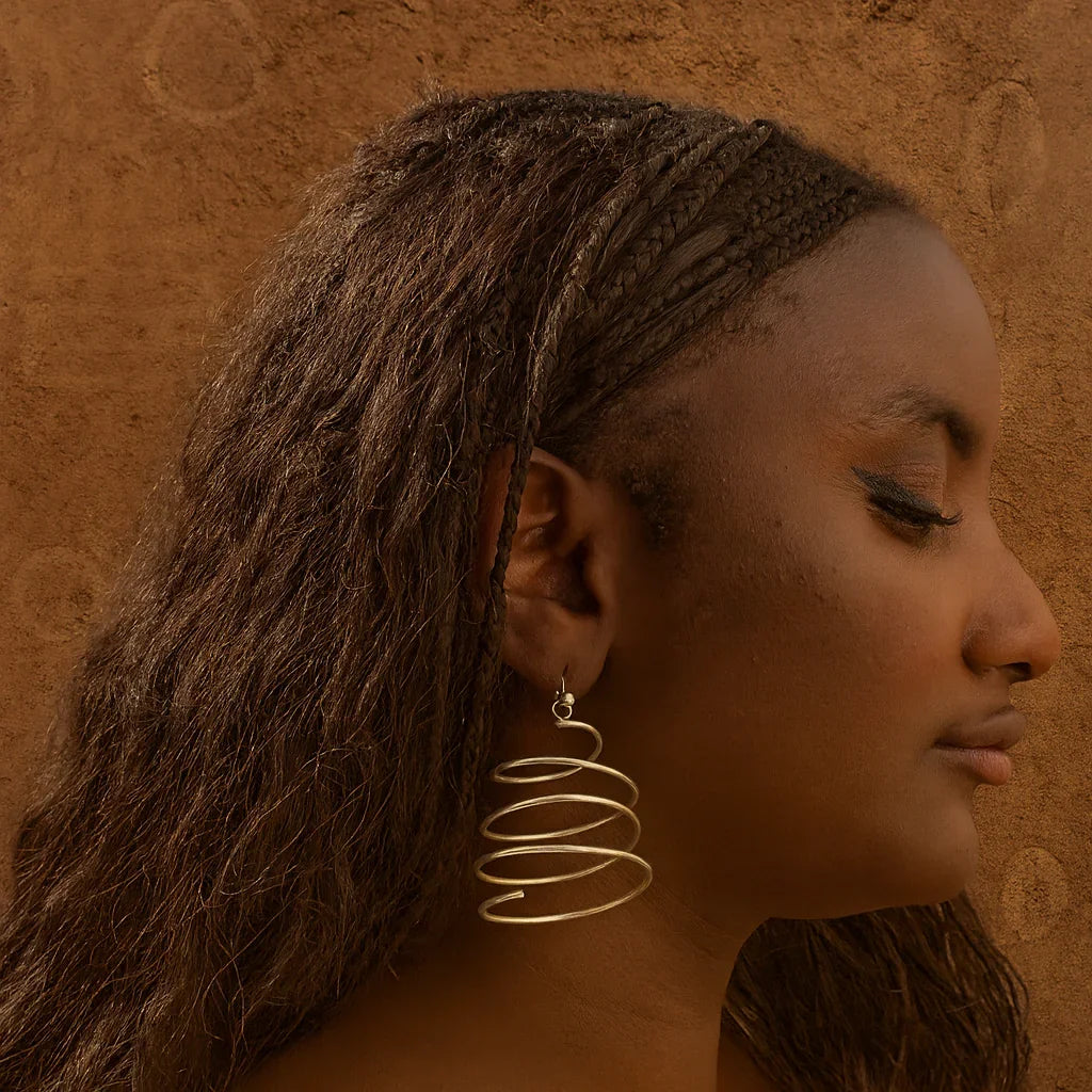 - Produktbeskrivelse : Disse dristige spiraløredobbene gir en moderne vri til tradisjonelt håndverk. De er håndformet av ren messing, og det lette, men likevel slående designet skaper en dynamisk følelse av bevegelse, noe som gjør dem perfekte for ethvert statement-antrekk.