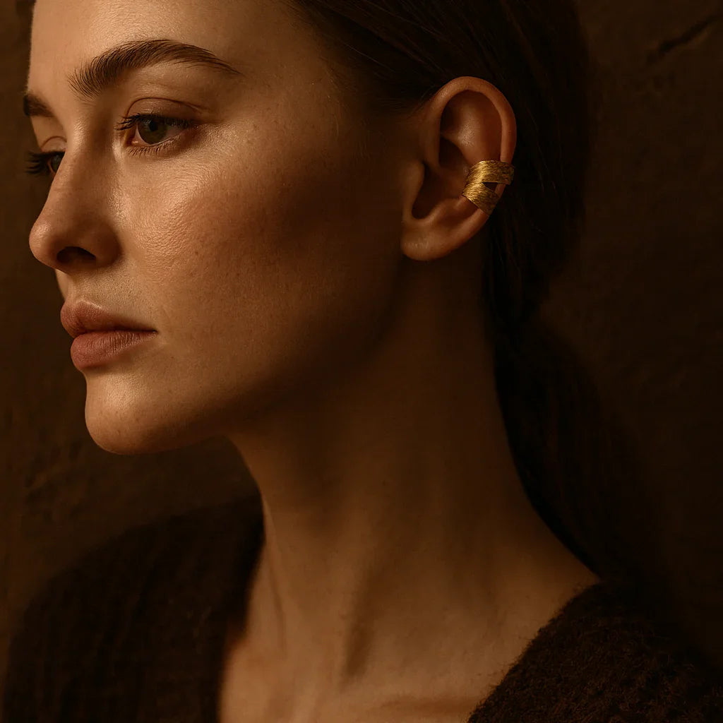 • Produktbeskrivelse : Denne mid-ear-mansjetten omslutter øret forsiktig med en strukturert overflate og organisk utskjæring som føles forankret, men likevel moderne. Et subtilt uttrykk, formet for hånd og båret uten hull. Lett og enkel å bruke hele dagen.