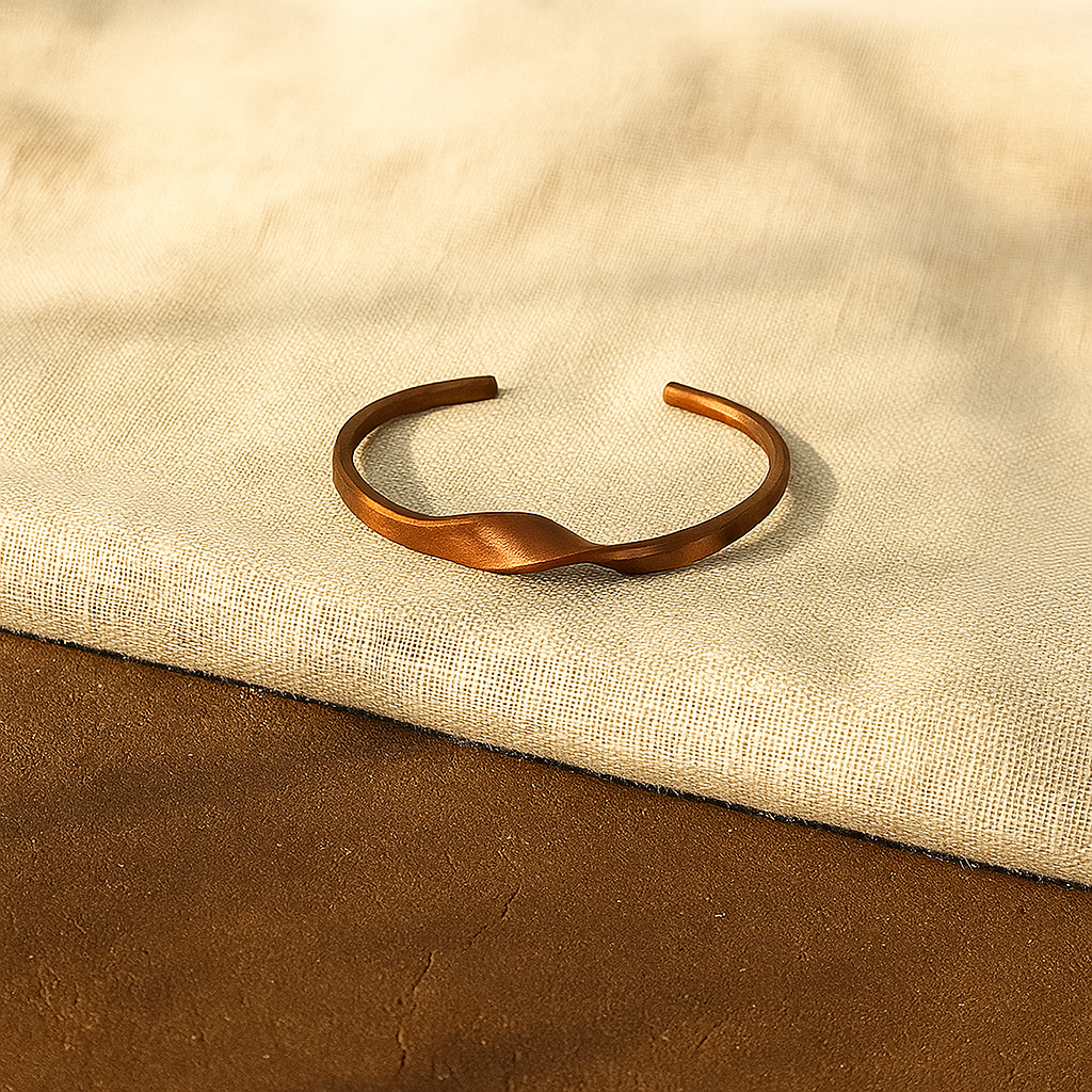 - Produktbeskrivelse : En skulpturell messingmansjett som vrir seg mykt rundt håndleddet. Håndlaget av håndverkere i Dakar, gjenspeiler den Oriaku Studios afro-skandinaviske harmoni gjennom form og tekstur.