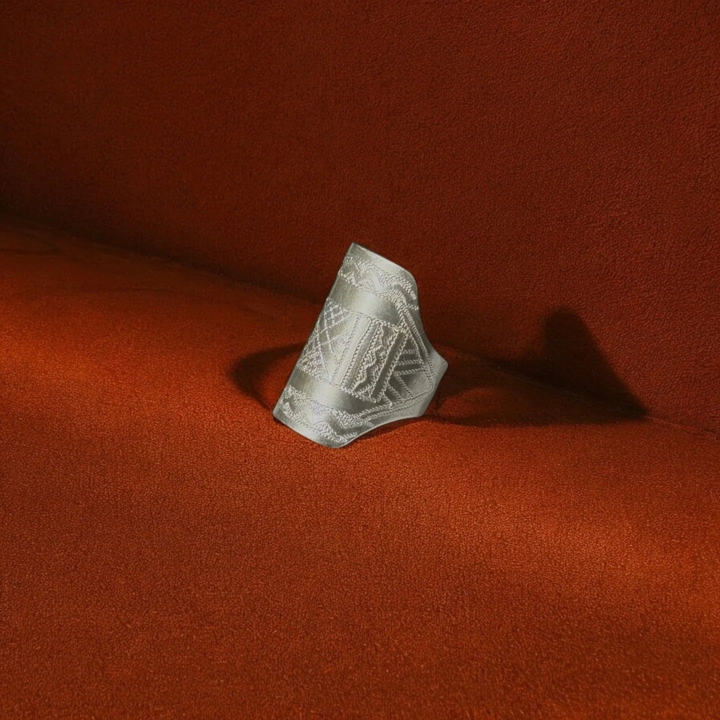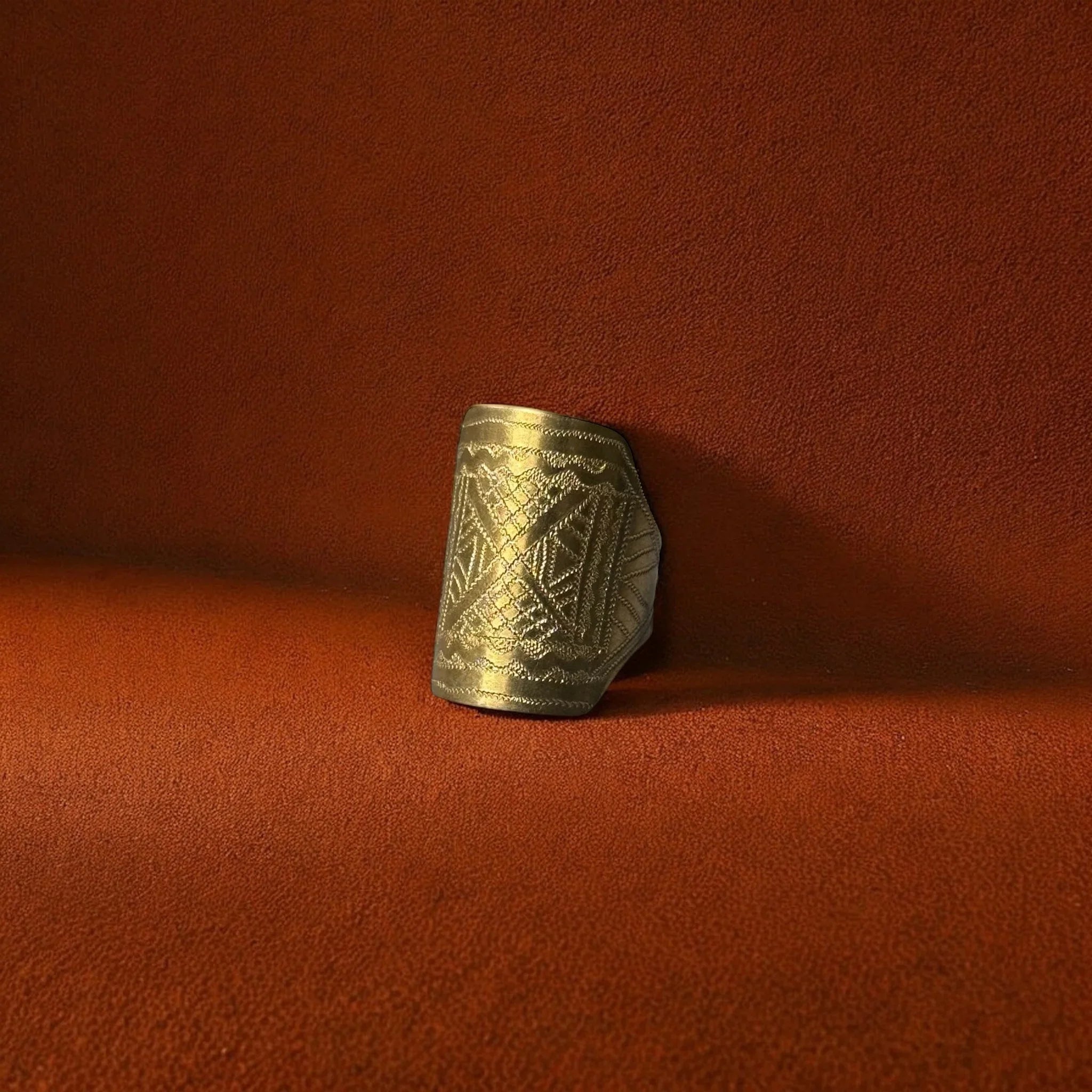 • Produktbeskrivelse : En dristig, gravert messingring som bærer energien fra eldgamle skjold. De strukturerte linjene og den teksturerte overflaten gjør den både til et statement og et symbol på styrke. Ingen størrelsesproblem! Denne ringen justerer seg til fingeren din for perfekt passform.