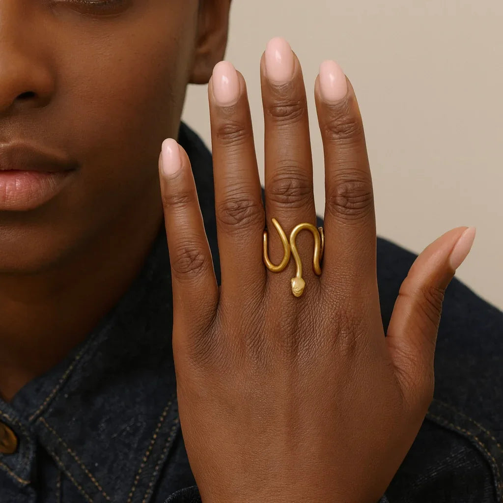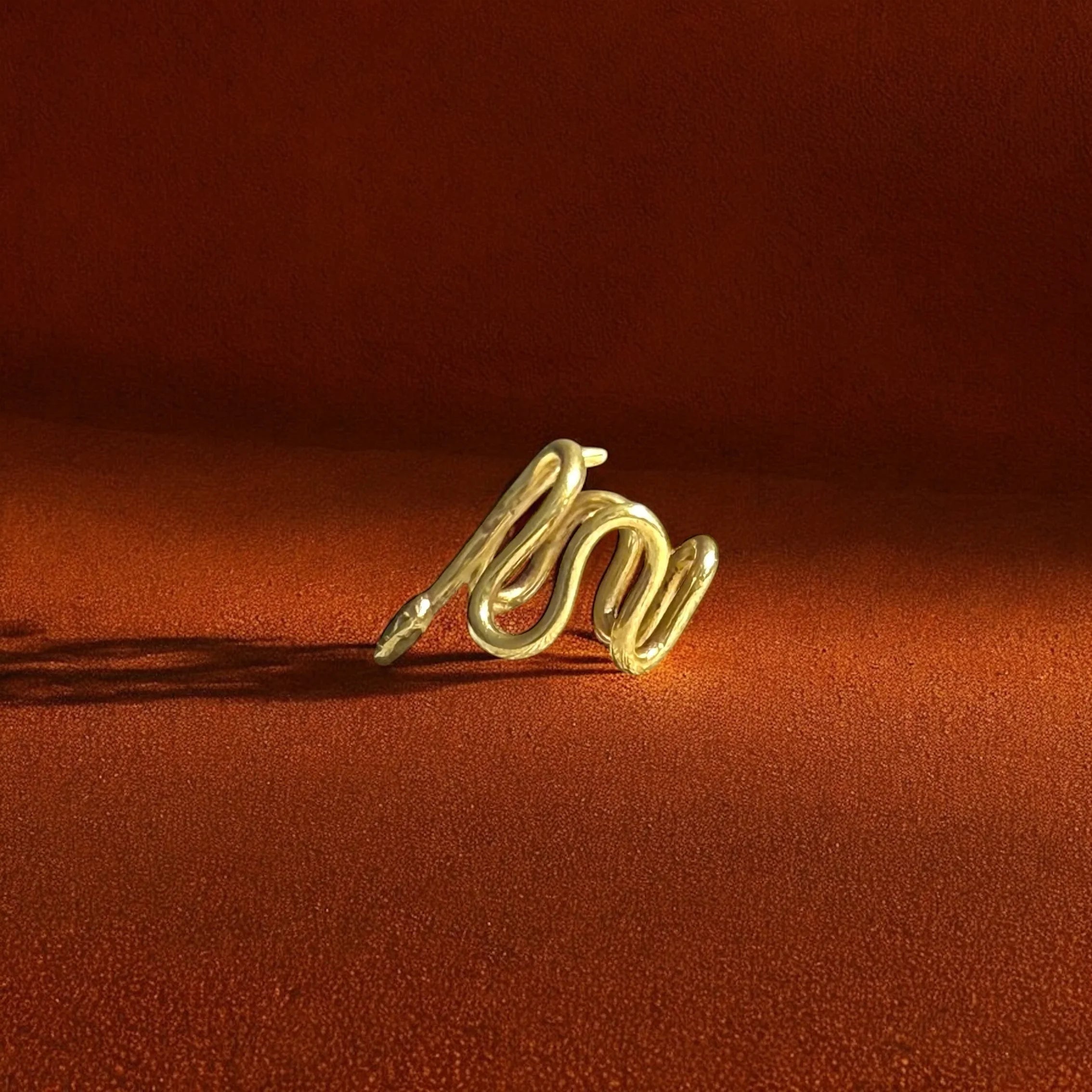 - Beskrivelse : Denne dristige slangeringen omgir seg med kraft og symboliserer beskyttelse, transformasjon og eldgammel visdom. Gbetó er håndlaget i messing av dyktige håndverkere i Senegal, og er mer enn en ring – den er et statement. Lett og komfortabel for hverdagsbruk.