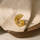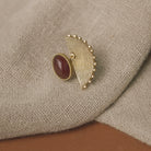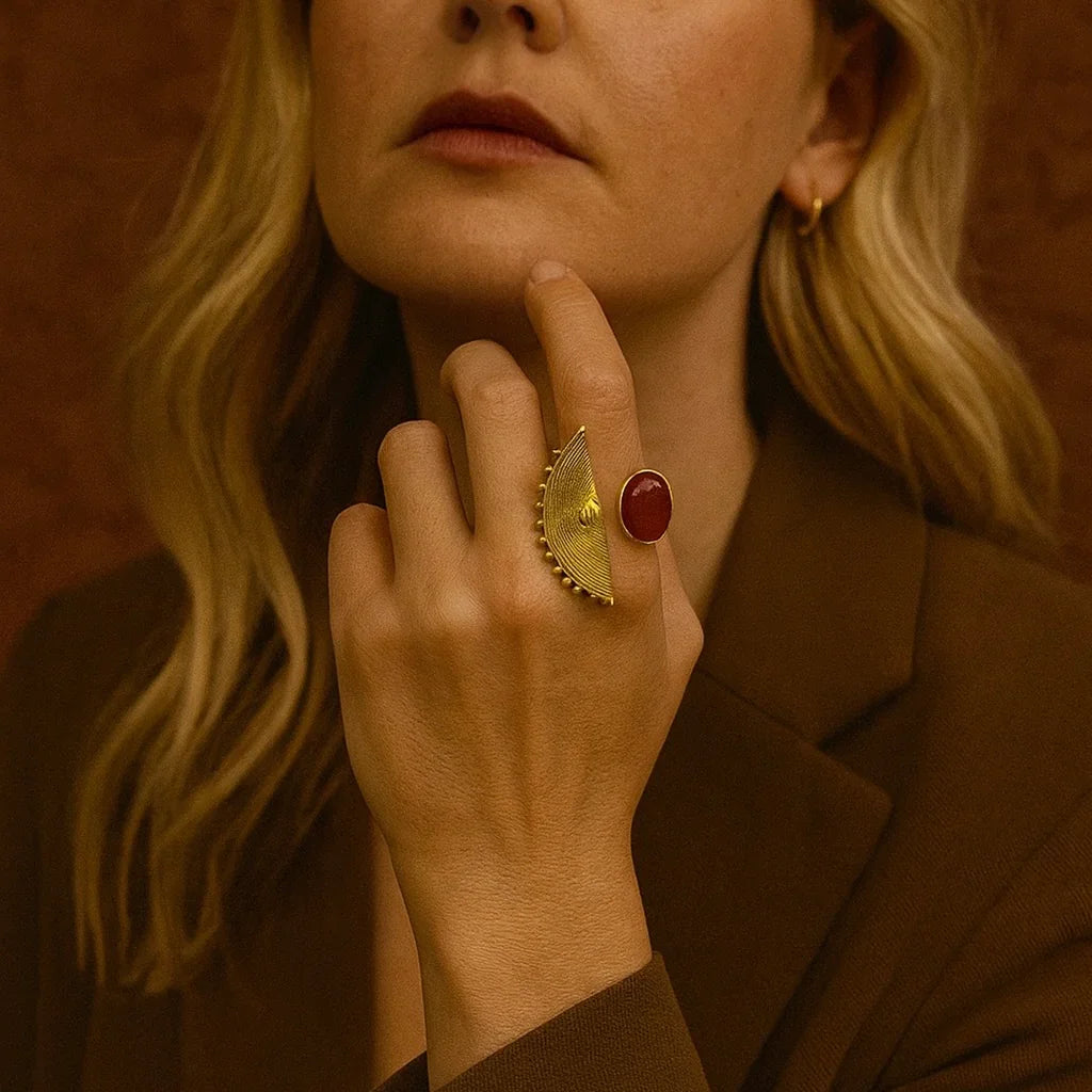 - Produktbeskrivelse : En iøynefallende messingring besatt med en dyp rød stein, innrammet av stiplede detaljer og trekantede utskjæringer. Dristig, men likevel elegant, formidler den tradisjonens styrke til moderne form.