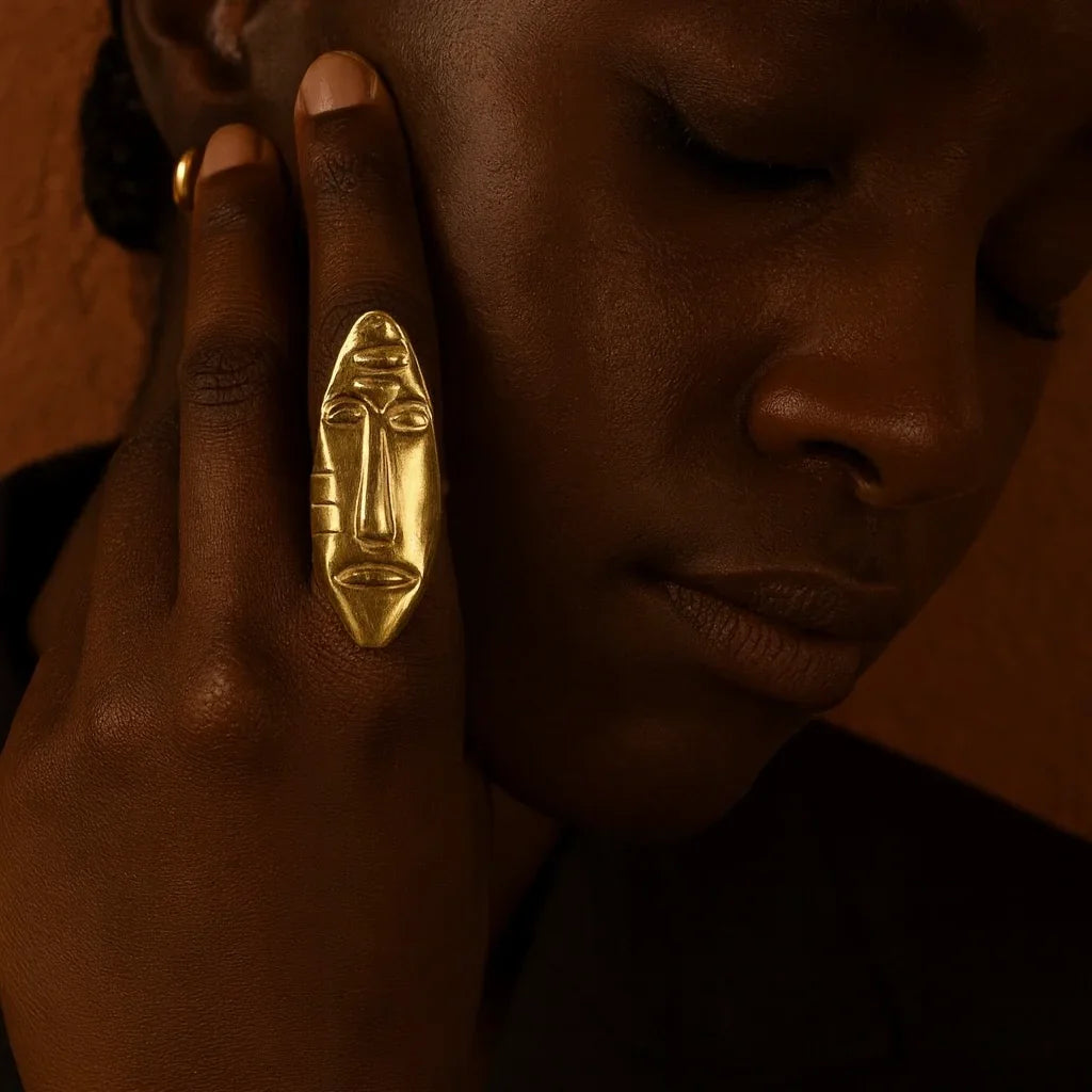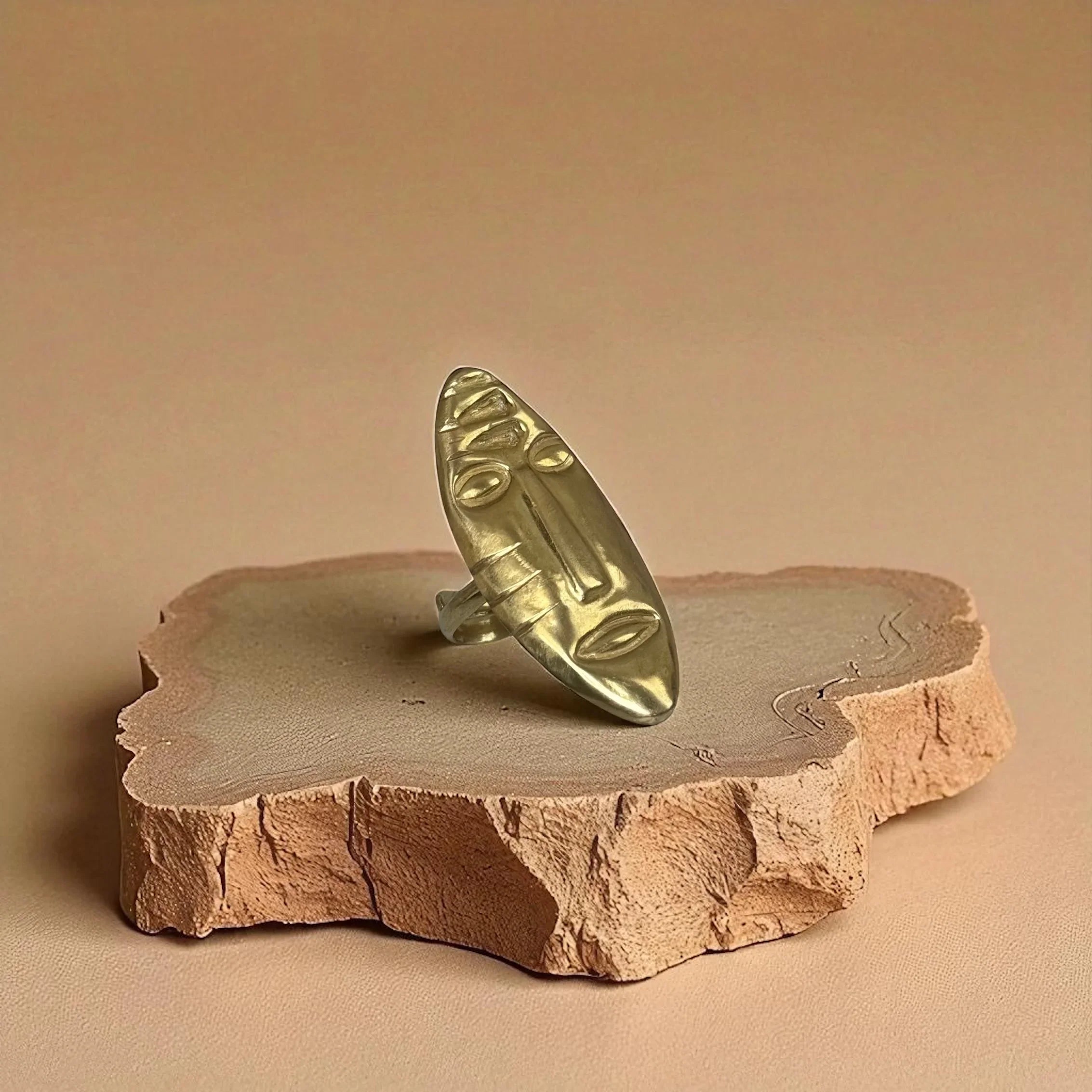 - Beskrivelse : Luma er dristig og skulpturell, og er mer enn en ring – den er en hyllest til afrikansk maskekunst og forfedrenes kraft. Håndlaget i messing, gjenspeiler den avlange urskiven tradisjonelle former som brukes i ritualer og historiefortelling over hele kontinentet. Lett, men likevel imponerende, fanger den lyset og holder oppmerksomheten.