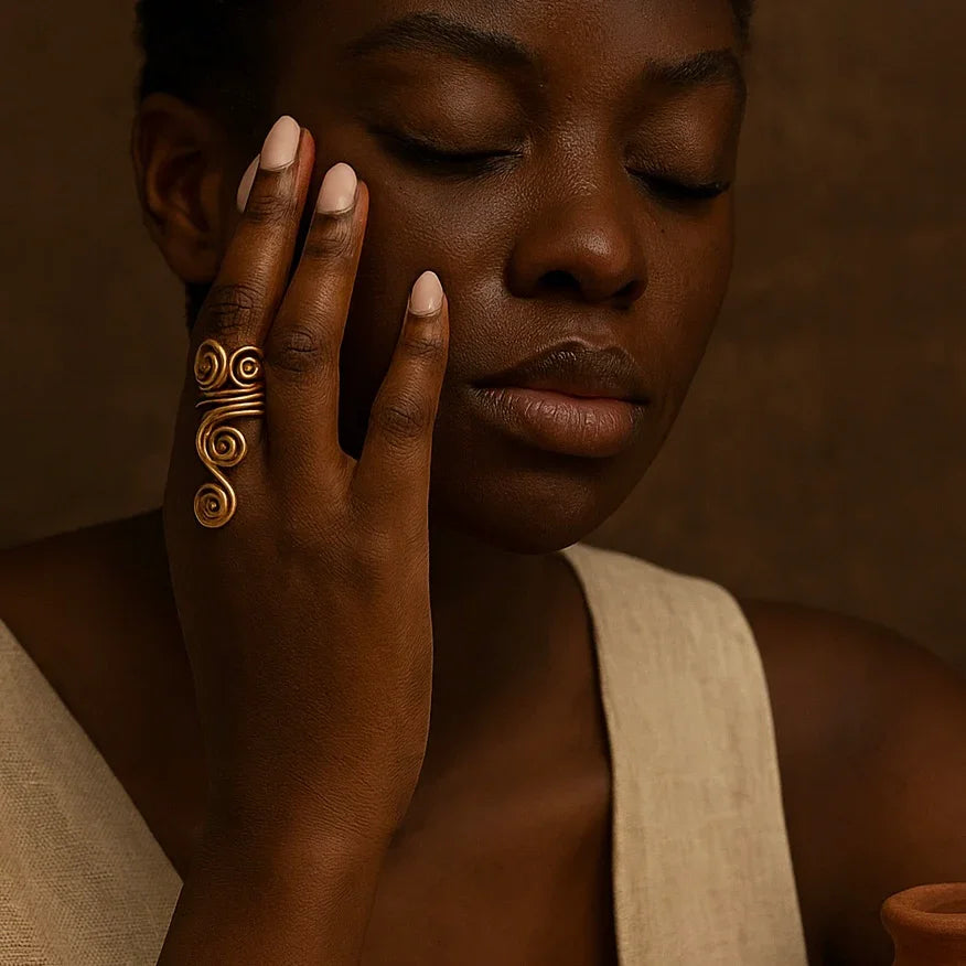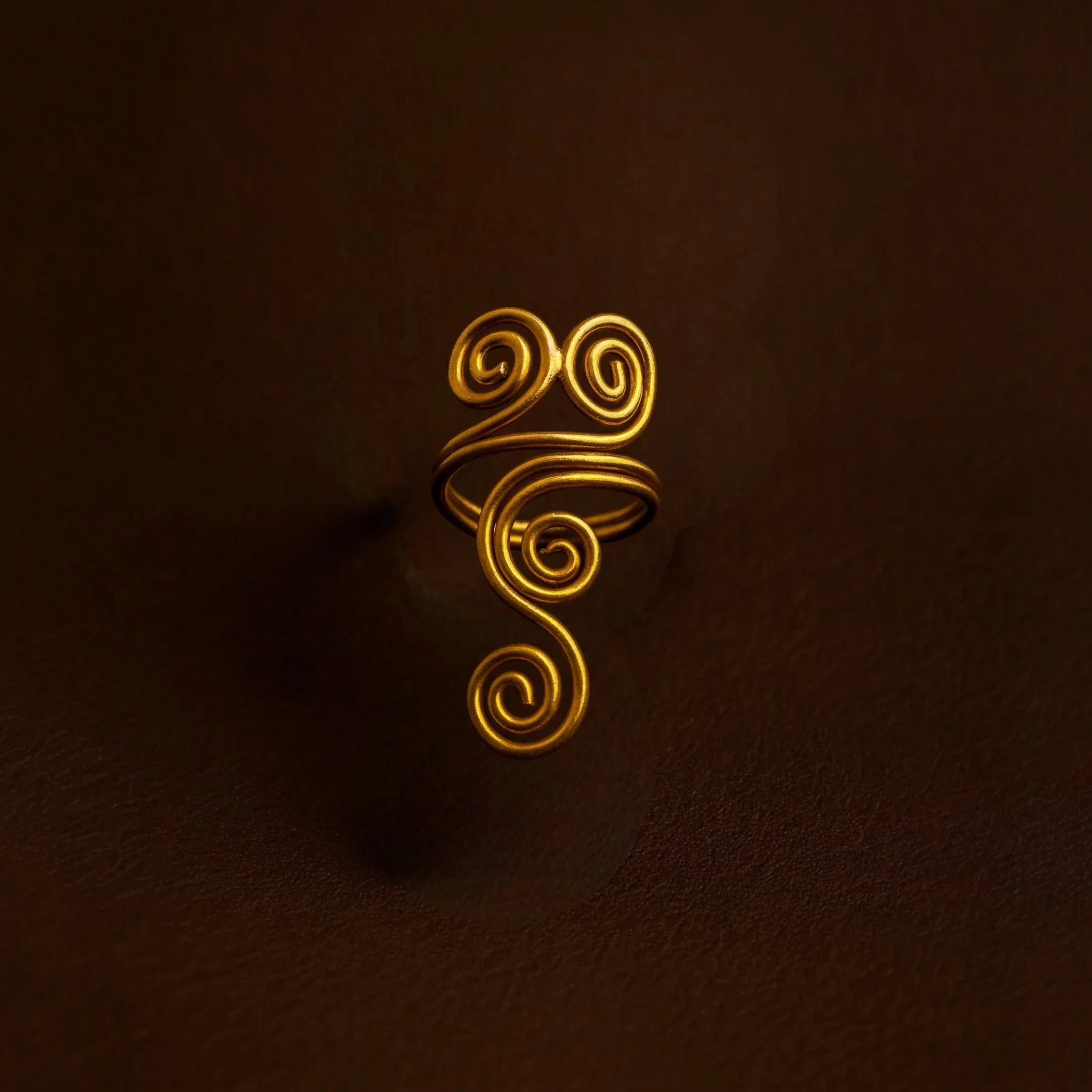 - Produktbeskrivelse : En dristig messingring formet i flytende spiraler, som gjenspeiler de endeløse syklusene av liv og bevegelse. Designet i Oslo, håndlaget i Senegal.