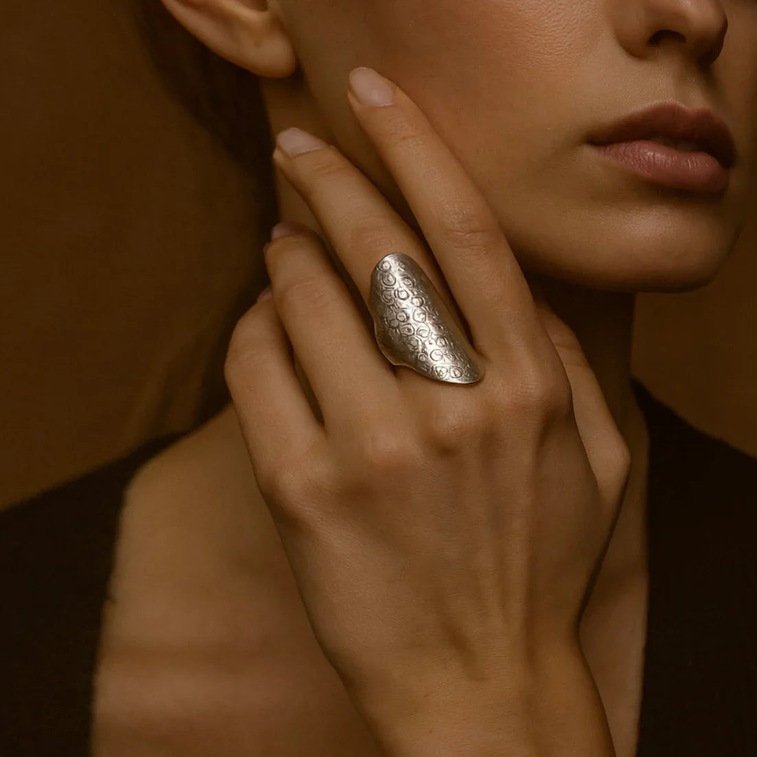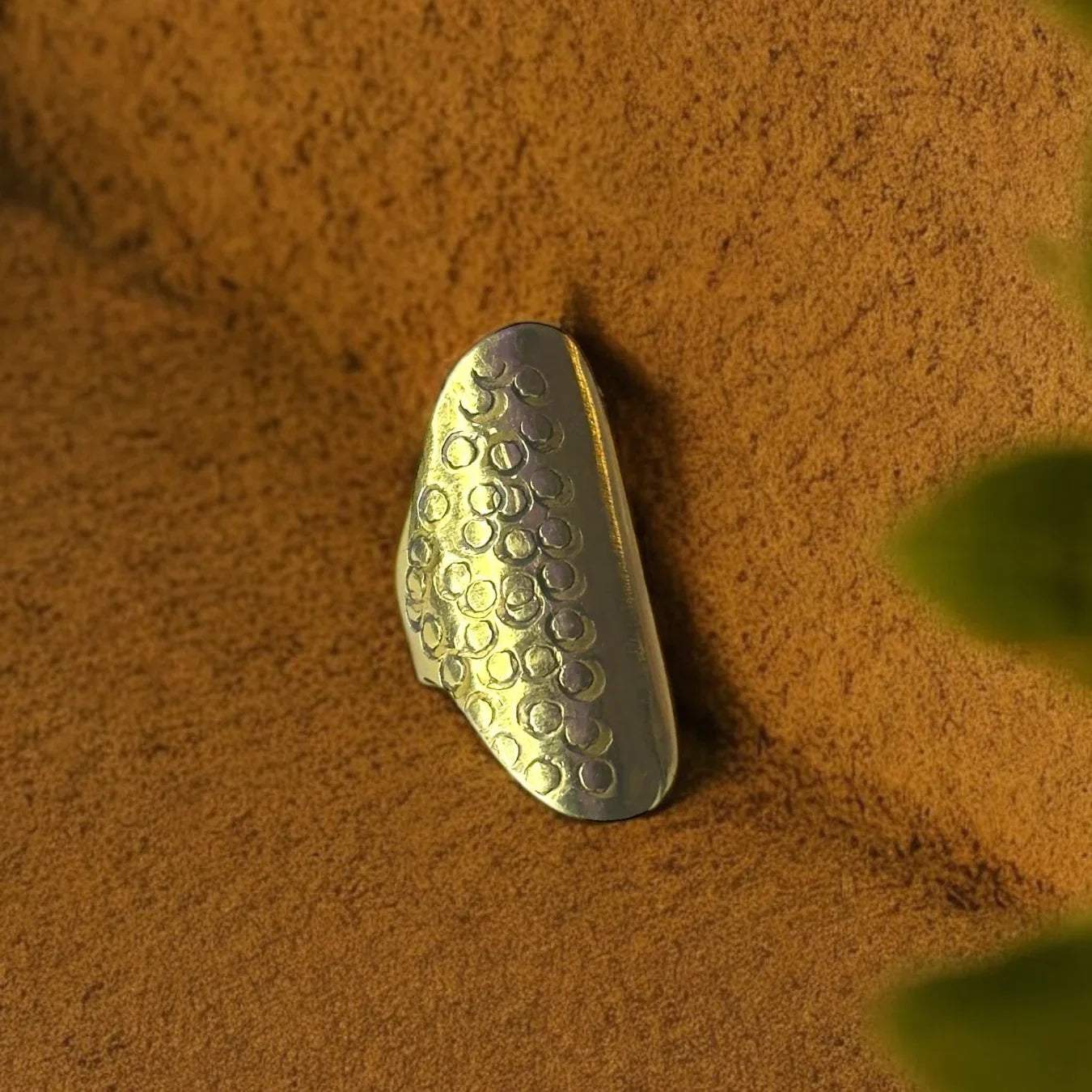- Beskrivelse : Zama-ringen gløder med styrke og tekstur. Den er håndstemplet i messing, og den stigende formen og de sirkulære merkene reflekterer lys som spredte stjerner eller eldgamle symboler.