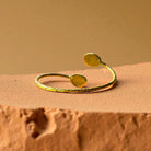 - Product Description: Open brass ring with two polished stones in contrasting colors for a balanced, modern look. Designed in Oslo, handcrafted in Senegal.