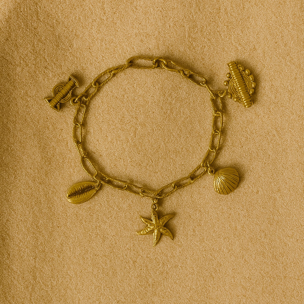 - Product Description: This charm bracelet carries a world of symbols — a spool for heritage, a cowrie shell for abundance, a starfish for grounded beauty. It can be worn on the wrist or ankle, letting you take your story wherever you go.