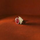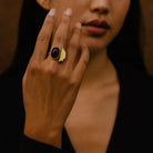 - Product Description: Bold and symbolic, this brass ring pairs a deep black or red stone with radiating arcs that reflect direction and focus.