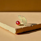 - Product Description: A statement brass ring set with a deep red stone, framed by dotted details and triangular carvings. Bold yet elegant, it carries the strength of tradition shaped into modern form.